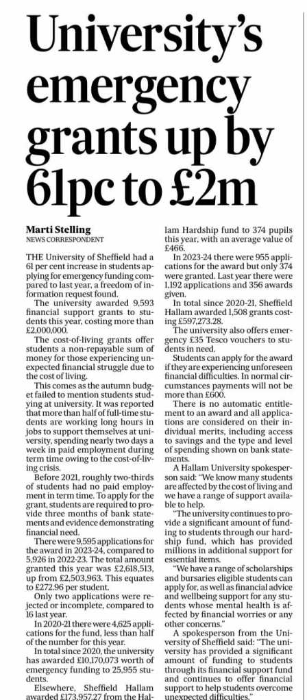 A Sheffield Hallam University spokesperson said: “We know that many of our students and their families are affected by the current cost of living, and we have a range of support available to help.
